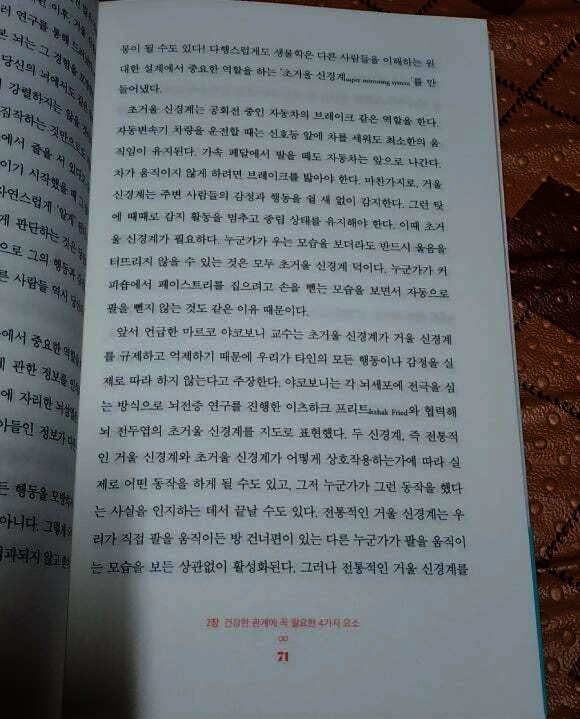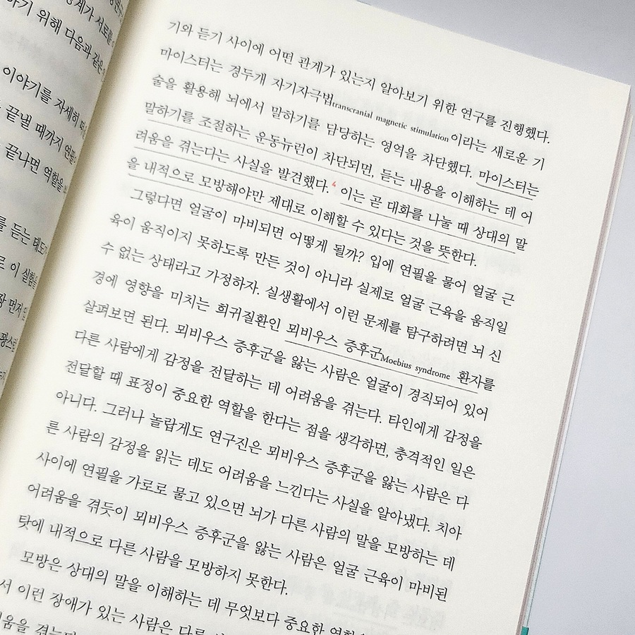 “공감”은 “거울 신경계”의 기능이다. 인간은 이 “거울 신경의 작용으로 타자의 행동과 감정을 이해하고 공감”하게 된다. “타인의 말을 이해하는 것 역시 뇌의 부위 가운데 자신이 말할 때 기능하는 부위가 작용해야” 타인의 말을 경청하며 이해할 수 있다고 한다. 결국 “타인의 말을 이해하는 건 뇌가 타인의 말을 따라 하며 스스로 의미를 각성해야 가능”한 것이다.