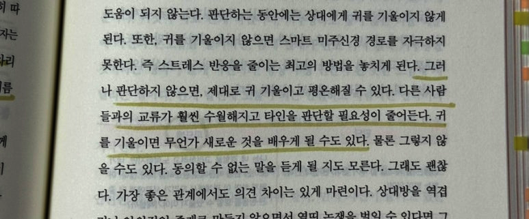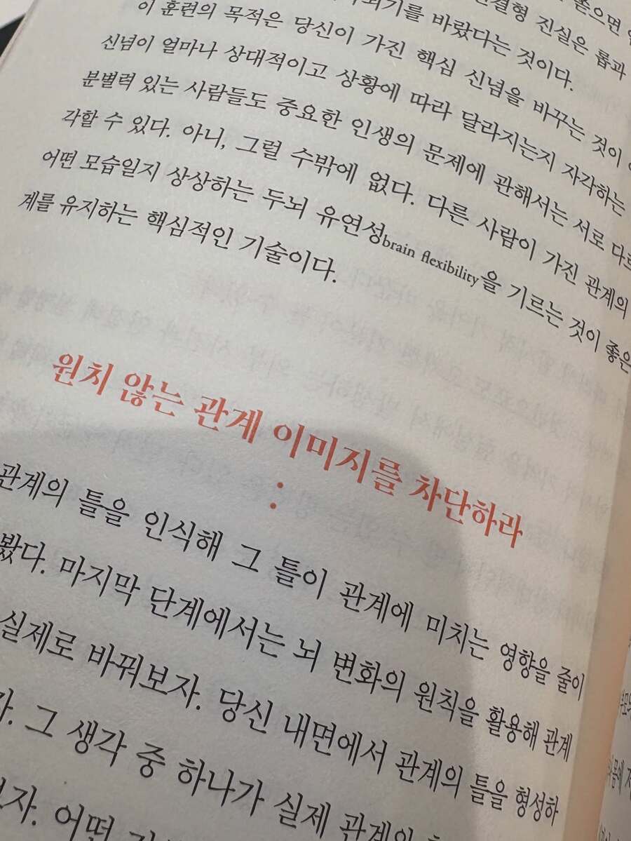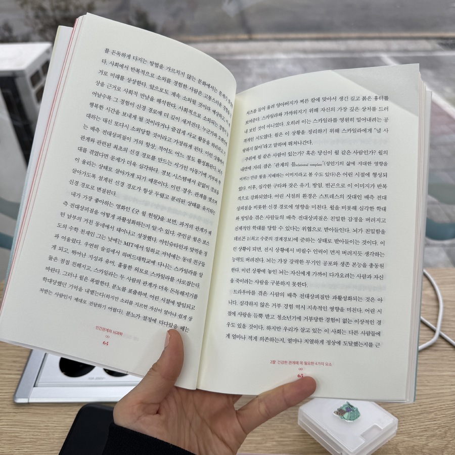 흔히 인간관계가 어려울 때 "내가 예민해서일까?" "원래 나는 혼자가 편한 사람이니까" 말하곤 한다. . 하지만 <인간관계의 뇌과학>은 다른 관점을 제시한다. . 관계의 문제는 성격 결함이 아니라 뇌의 연결 방식에 있다는 것이다. . 저자는 관계 중심 치료 이론을 기반으로 인간의 뇌는 본래 연결되도록 설계되어 있다는 점을 강조한다. . 우리는 독립을 위해 진화한 존재가 아닌 연결을 통해 안정과 활력을 얻도록 만들어진 존재라는 전제로 이야기는 출발한다. ㅡ 1️⃣ CARE ㅡ 관계의 네 가지 신경 경로 ✔️C (평온) : 스마트 미주신경 : 믿을 수 있는 사람과 함께 있을 때 스트레스가 줄어드는 경험. : 관계는 긴장을 유발하는 것이 아니라 안정을 회복시키는 통로가 될 수 있다. . ✔️A (수용감) : 배측 전대상피질 : 소외감을 느낄 때 우리 뇌는 실제로 '통증' 신호를 보낸다. : 거절은 단순한 감정이 아니라 신경학적 고통이다. 반대로, 인정받는 경험은 뇌를 회복시킨다. . ✔️R (공감) : 거울 신경계 : 다른 사람을 '보고' 모방할 때, 공감 경로가 활성화된다. : 공감은 노력 이전에 신경 시스템의 작동이다. . ✔️E (활력) : 도파민 보상 체계 : 좋은 관계 속에서 우리는 열정과 에너지를 얻는다. : 건강한 연결은 뇌의 도파민 시스템을 활성화시키고 삶의 활력을 회복시킨다. ㅡ 이 네 가지 경로가 건강하게 작동할 때 관계는 부담이 아닌 회복의 공간이 된다. . 반대로 어린 시절의 상처나 반복된 부정적 경험은 이 회로를 위축시키고 "관계는 피곤하다" "혼자가 편하다" 는 신념을 강화할 수 있다. ㅡ 2️⃣ 혼자가 편한 이유 ㅡ 학습된 신경 경로 이 책에서 가장 인상 깊었던 부분은 관계를 멀리하는 것이 성격적인 부분이라기보다 과거 경험으로 인해 뇌가 안전을 위해 선택한 결과일 수 있다는 사실이다. . 관계에 어려움을 겪었던 경험이 많다면 뇌는 위험을 회피하는 방향으로 회로를 재배선 한다. . ✔ 뇌는 바뀔 수 있다! 신경가소성 덕분에 우리는 반복적이고 의식적인 경험을 통해 관계 회로를 다시 강화할 수 있다. . 3️⃣ 실제 훈련방법 신경 시스템 차원의 재훈련을 설명한다. . ㅁ 안정감을 회복하는 호흡과 신체 조절 ㅁ 판단 대신 경청 연습하기 ㅁ 안전한 관계 안에서 소속감 확장하기 ㅁ 활력을 주는 관계를 의식적으로 선택하기 . 관계를 바꾸는 일은 태도를 바꾸는 일이 아니라 뇌 회로를 다시 연결하는 과정이다. ㅡ 4️⃣내향인으로서 다시 생각해본 관계 내향인인 나는 사람을 만나고 돌아오면 자주 말하곤 한다. . "사람 만나면 기 빨리는거 같아." "혼자가 편한걸까?" . 관계의 문제가 생길때마다 '나는 왜 이런 성격일까' 스스로 자책했던 날들도 많았다. . 하지만 이 책은 관계는 노력의 문제가 아니라 신경 회로의 문제일 수 있다고 말한다. . 그리고 다행히도 그 회로는 다시 연결 될 수 있다. ㅡ 5️⃣우리는 정말 혼자 살아갈 수 있을까 인류가 탄생한 이래 관계를 맺지 않고 살아간 시대는 최근의 현대 사회가 거의 처음이라고 한다 . 혼자가 편하다고 말하는 사람들조차 깊은 곳에는 여전히 연결을 갈망하는 시스템이 자리 잡고 있을 것이다. . 관계는 약점이 아니라 인간이라는 존재의 내장된 기본 설계다. . 그래서 어쩌면 우리를 지치게 하는 것은 관계 자체가 아니라 안전하지 못한 연결이었는지도 모른다. . 적절한 관계 설계는 뇌를 다시 안정시키는 과정이다. . 지금 나의 뇌는 연결을 위협이 아닌 안전으로 느끼고 있을까. . 혼자가 편하다는 말 뒤에 숨겨진 나의 오래된 신경 경로를 다시 돌아보게 한다. ㅡ |