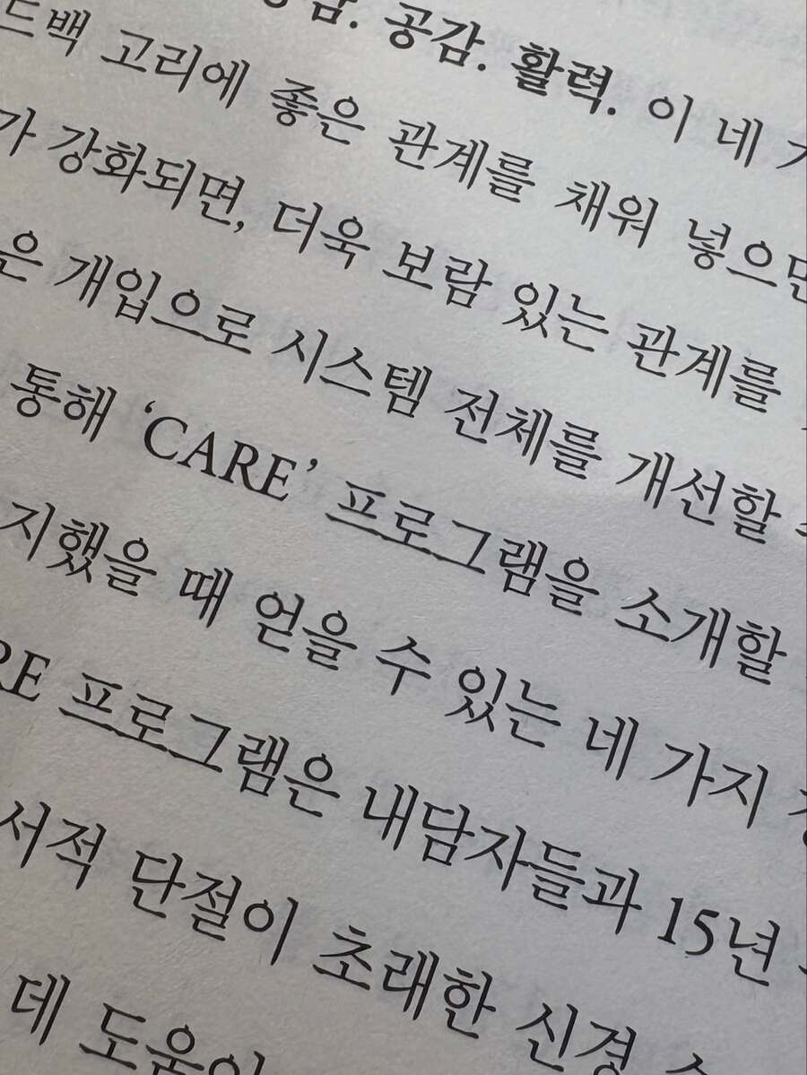 저자 에이미 뱅크스는 뇌과학 연구자이고 리 앤 허시먼은 논픽션 작가입니다. 아마도 전문분야에 대한 내용을 에이미 뱅크스가 쓰고 작가인 리 앤 허시먼이 내용을 다듬는 식으로 본 책이 출간된게 아닌가 싶습니다. 이 책을 읽게 된 계기는 메타인지심리학연구자로도 유명한 김경일교수님의 추천작이라고 되어 있어서 읽었어요. 이야기를 참 재미있게 하시는 교수님이시죠. 김경일교수님이 추천한다고 하는 심리학이나 이런 뇌과학 책들은 내용이 꽤 괜찮더라구요. 그래서 이번에도 읽게 되었습니다. 내용은 1장 인간은 독립적으로 살아갈 수 없다. 2장 건강한 관계에 꼭 필요한 4가지 요소 3장 당신의 뇌를 바꾸는 3가지 규칙 4장 관계를 변화시키는 CARE 프로그램 5장 편온함 : 날뛰는 신경계 진정시키기 6장 수용감 : 소외감을 막고 소속감을 느끼기 7장 공감 : 타인과의 경계 허물기 8장 활력 : 건강한 관계로 도파민 얻기 9장 뇌를 건강하게 유지시키는 비결 이렇습니다. 사실 인간관계에 대해서 8장까지 쭉...내용이 서술되어 있다가 9장 마무리장에서 음?하고 의문이 드는... 갑자기 뇌를 쉬게하기 위해 물마셔라 잠을 자라 라는 둥의 누구나 다 아는 그런 얘기로 마무리 지어서 끝맺음이 좀 아쉬운 책입니다.