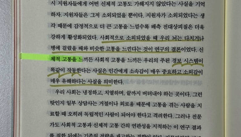 세상을 살다 보면 인간관계 때문에 지치고, 차라리 혼자가 편하다고 느낄 때가 많았습니다. 하지만 이 책을 읽고 나니, 그런 생각조차 우리 뇌가 보내는 '생존을 위한 신호'였다는 것을 깨닫게 되었습니다. 책에서 가장 흥미로웠던 부분은 거울 신경계에 대한 이야기였습니다. 타인의 슬픈 이야기를 들을 때 내 손이 따뜻해지거나, 누군가 고통스러워하는 모습만 봐도 내 뇌의 특정 부위가 활성화된다는 사실이 신기했습니다. 우리가 타인의 감정에 이입하는 것은 의지력의 문제가 아니라, 우리 뇌가 이미 상대방의 경험을 내 것처럼 시뮬레이션하고 있기 때문이라는 거죠. 이 사실 하나만으로도 누군가를 이해하려 애쓰는 제 노력이 헛되지 않았음을 위로받는 기분이었습니다. 우리는 몸이 아프면 병원에 가지만, 마음이 외로운 건 참고 넘기려 합니다. 하지만 뇌과학적으로 볼 때, 따돌림이나 소외로 느끼는 고통은 신체적인 고통과 동일한 뇌 영역을 자극한다고 합니다. 인간관계에서 오는 상처가 왜 그렇게 아팠는지, 과학적으로 이해하고 나니 비로소 제 상처를 객관적으로 마주할 수 있게 되었습니다. 이 책은 인간관계가 단순히 '성격'의 문제가 아니라 '건강'의 영역임을 명확히 짚어줍니다. |