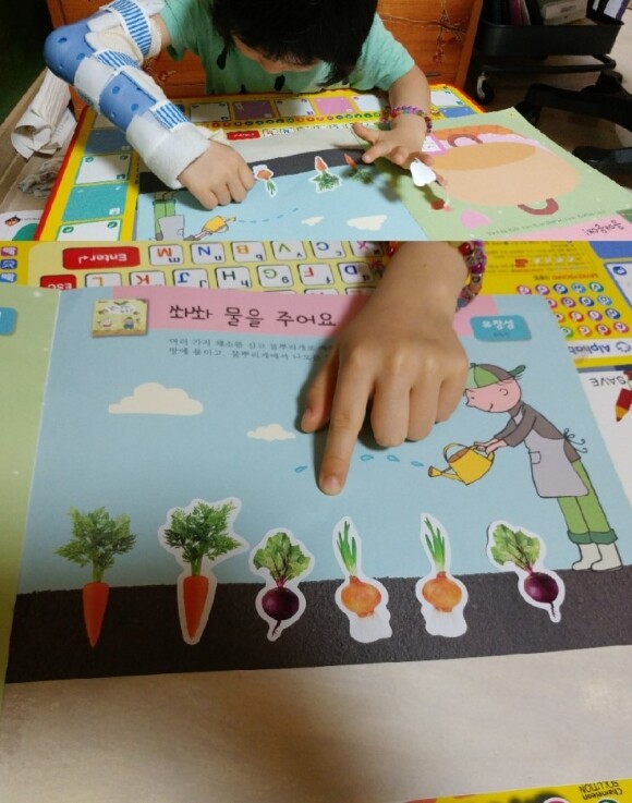 빵의 수가 몇개인지 세워보는건데요 당연히 10개씩 묶은 다음 묶음 수가 6개 낱개는 3개 그래서 빵의 총 갯수는 바로 63! 창의 놀이편에서는 상상력과 창의력을 키워보는 시간인데요 모든 채소에 골고루 물을뿌려 잘 키워보는거에요.. 당근,양파,콜라비를 쑥쑥 잘 키워보았습니다. ![]() ![]()