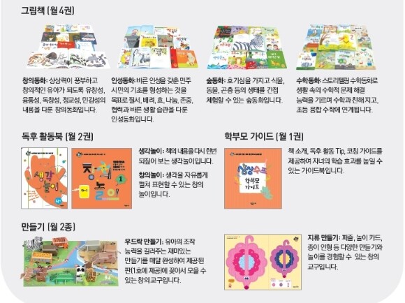 유아동화/유아독서/독서프로그램/누리과정독서/상상수프/독서학습지 유아 통합 독서프로그램 상상수프 누리과정에 꼭 맞는 영양 만점 독서 프로그램 상상수프는 유아 공통 교육과정인 누리과정의 12개 생활주제와 5대영역을 제대로 반영한 독서프로그램입니다. 아이들이 책을 통해 기본지식을 배우고 풍부한 상상력을 길러볼수있습니다. 상상수프는 가(4세),나(5세),다(6세),라(7세) 4단계로 되어 있고 월별 구성은 그림책4권,독후활동북2권,만들기2종 학부모가이드1권 입니다.