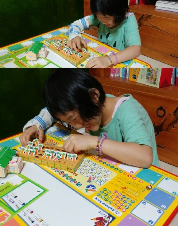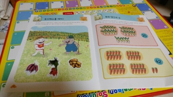 아직은 서툴지만 한글을 떼었기에 조금씩 읽는 연습을 하고 있는데 한문장씩 또박또박 읽어가고 있어요.. 토끼와 두더지는 텃밭이 딸린 집으로 이사를 왔어요 텃밭 앞쪽은 토끼집,텃밭 아래쪽은 두더지 집이었어요 토끼와 두더지는 텃밭을 두고 서로 자기밭이라 싸움을 했고 결국 주인을 가리는 시합을 하게 되었습니다. ![]() 텃밭 하나를 가지고 싸운 토끼와 두더지 원숭이 할아버지는 셈이 빠른사람이 텃밭의 주인이라고 하는데요.. 과연 누가 셈을 잘할까요? 책을 읽기도 전에 우리딸...토끼라고합니다. 왜그렇게 생각했어? 동화책 속의 토끼는 영리하다며..ㅎㅎ 책을 읽으면서 셈을 하고 있는 우리둘째~~!! 수학동화 책인만큼 책을 읽으면서 셈 공부를 자연스럽게 할 수 있어요 ![]()