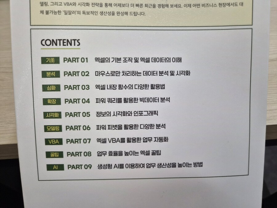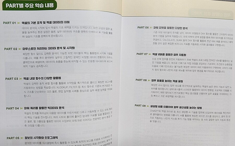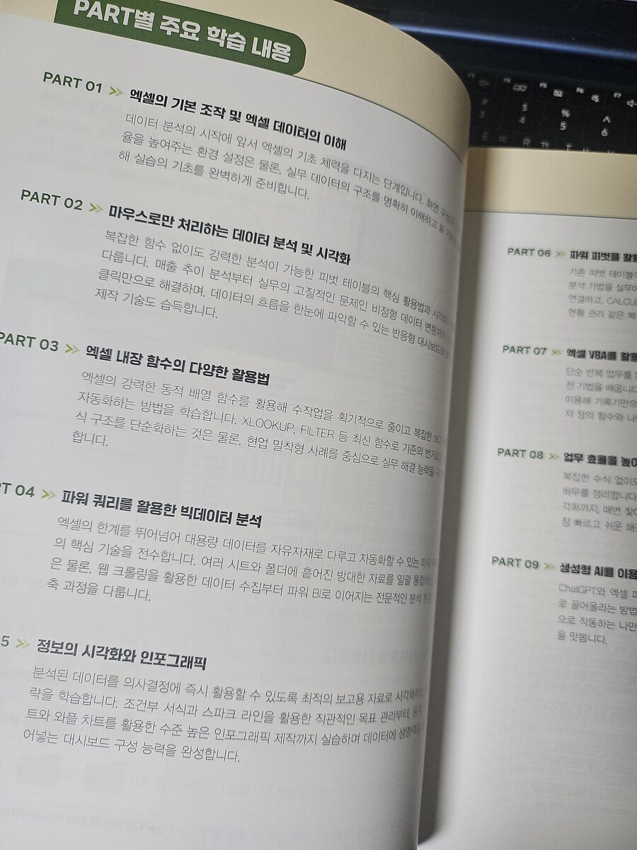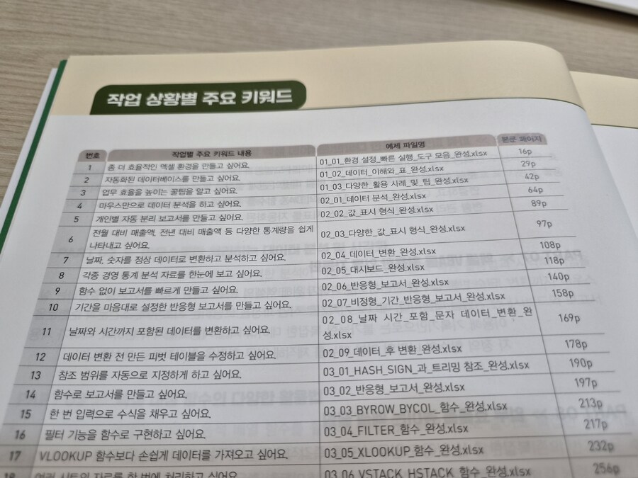 저처럼 엑셀에대한 "뭐를 모르는지도 모르는" 막막한 상태의 독자들에게 가장 중요한 부분은 도입부의 '작업 상황별 주요 키워드' 인데요. 방대한 내용 중 지금 당장 내 업무에 필요한 해결책을 네비게이션처럼 바로 찾아갈 수 있게 설계되어 있어 실무에서 효율적이게 이용할 수 있는 페이지입니다.
