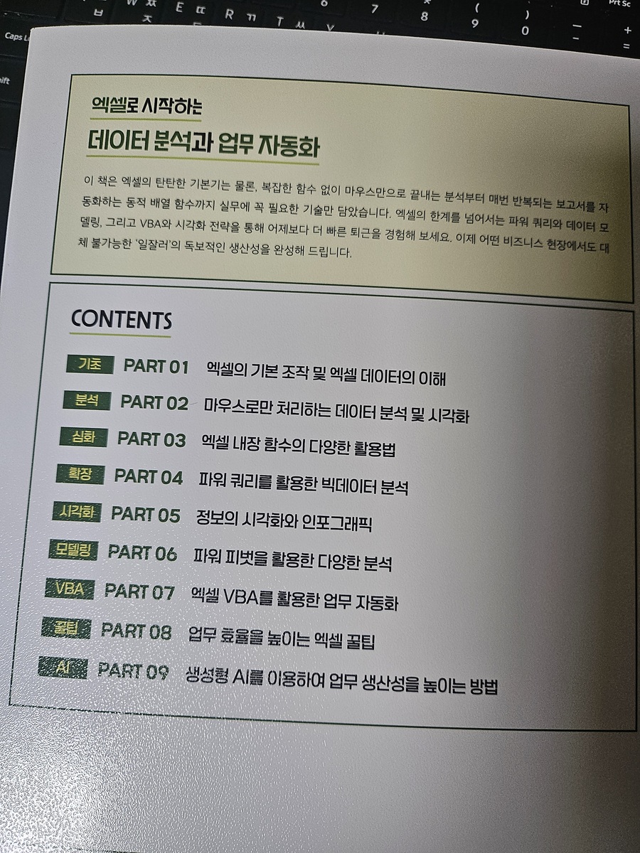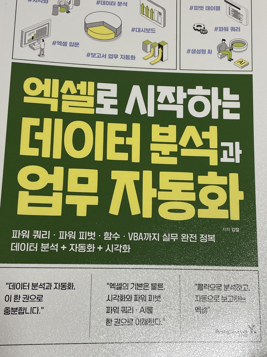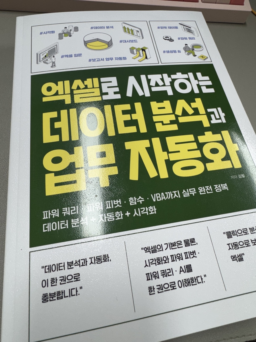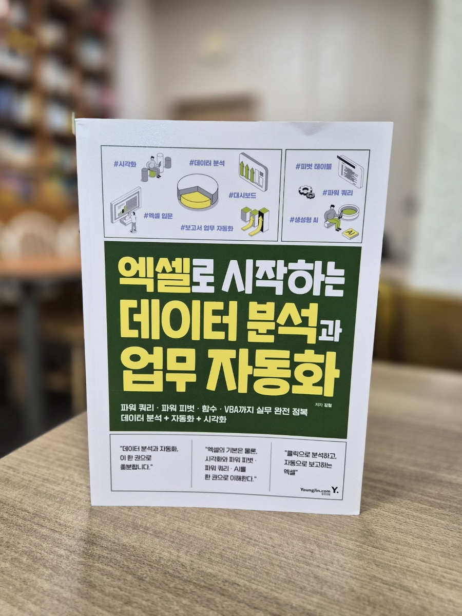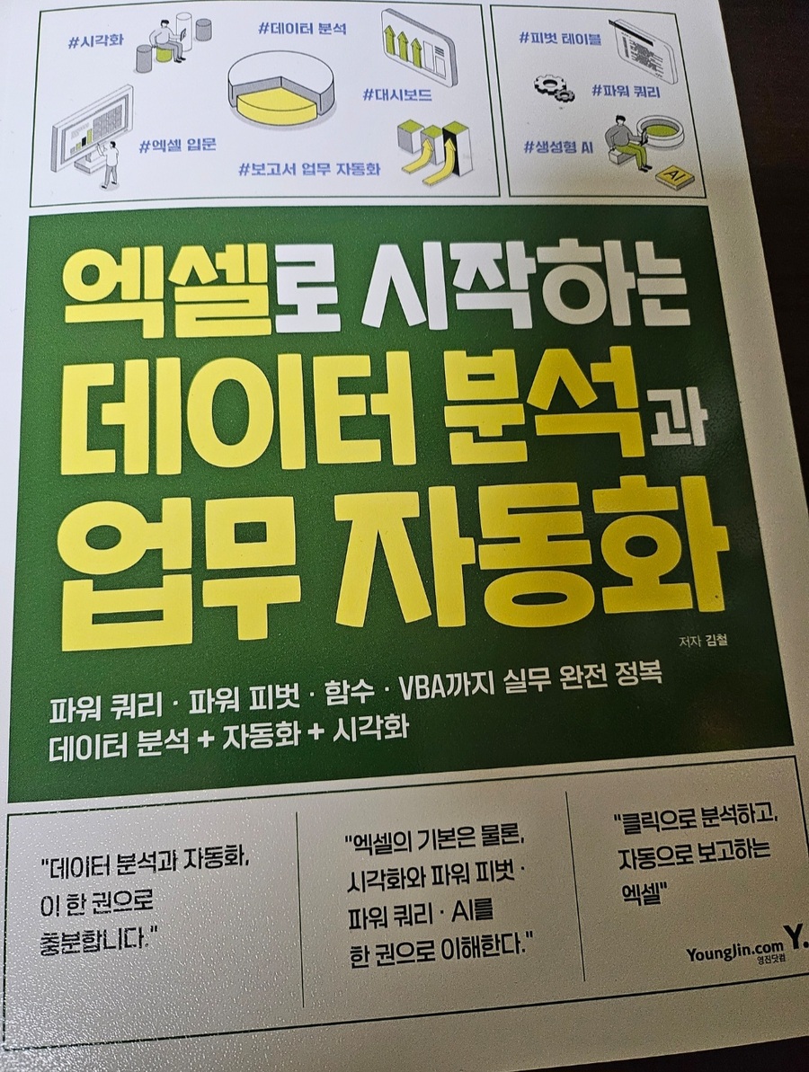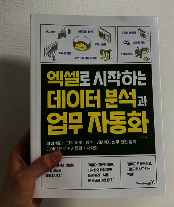 또한 영진닷컴 홈페이지에서 제공하는 무료 실습 예제 덕분에 눈으로만 보는 공부가 아니라 직접 익히는 학습이 가능한 책입니다. 잘 구성된 파트별 예제 파일을 활용하니 실무 환경과 유사한 연습을 반복할 수 있어 너무 좋았어요 단순한 엑셀 학습을 넘어 엑셀 독학을 꿈꾸는 분들, 데이터 기반으로 똑똑하게 일하며 칼퇴를 꿈꾸는 모든 분께 이 책을 추천합니다! 단순히 기능을 나열하는 책이 아니라, 실무에서 마주하는 문제들을 어떻게 해결할지 알려주는실전 지침서에 가까운 책으로 옆에 두고 계속 보기 좋은 엑셀 바이블입니다! #엑셀로시작하는데이터분석과업무자동화 #영진닷컴 #김철 #엑셀교재 #데이터분석 #업무자동화 #직장인자기계발 #엑셀독학 #엑셀VBA #실무엑셀 #서평단 #도서리뷰 #칼퇴비법 #엑셀책추천 |