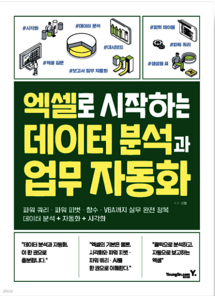 이처럼 데이터를 정리하고, 반복 작업을 줄이며, 자동으로 결과를 생성하는 구조는 재무, 영업, 인사 등 다양한 업무에 동일하게 적용됩니다. 엑셀 활용 능력은 업무를 구조적으로 재구성하는 방식을 구축하는 데 도움이 됩니다. 엑셀을 사용할 줄 아는 것과 엑셀로 업무를 재구성하는 것은 분명히 구분됩니다. <엑셀로 시작하는 데이터 분석과 업무 자동화>는 엑셀을 단순 입력 도구로 사용해 온 직장인, 반복 업무를 줄이고자 하지만 체계적인 방법을 갖추지 못한 직장인에게 추천합니다. 또는 업무 과정을 구조적으로 개선하려는 사람에게 추천합니다. #엑셀로시작하는데이터분석과업무자동화, #엑셀, #데이터분석, #업무자동화, #김철, #영진닷컴, #엑셀데이터분석, #엑셀업무자동화, #엑셀피벗테이블, #엑셀함수활용, #파워쿼리, #엑셀자동화, #직장인엑셀, #엑셀보고서자동화, #데이터구조화, #엑셀실무, #엑셀초보탈출, #엑셀실무활용, #데이터정리방법 엑셀로 시작하는 데이터 분석과 업무 자동화