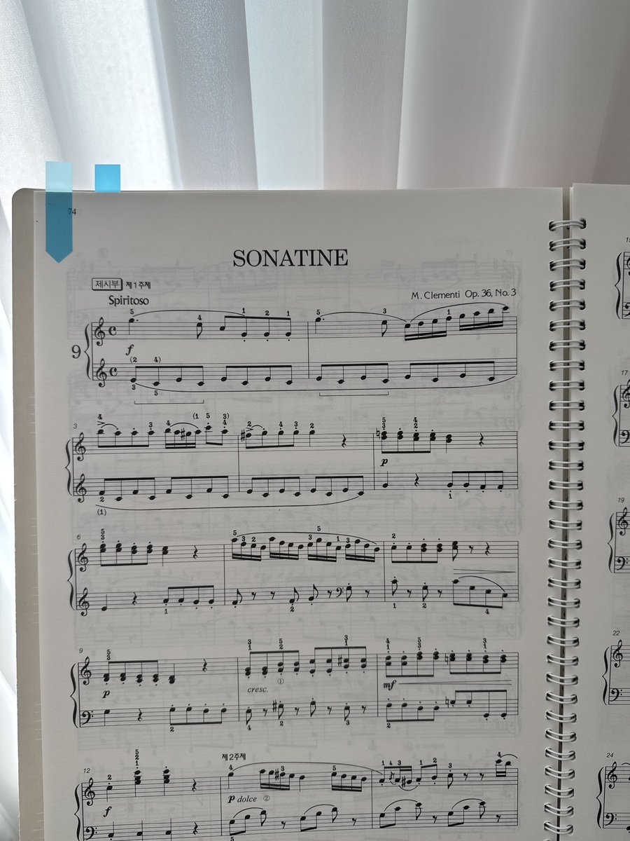 어릴때부터 계속 이어져오는 이 디자인. 너무 정겹고 좋아요. 요즘 어린아이들을 겨냥해 정말 많은 캐릭터들이 나오는데 유아교재나 소곡집이면 몰라도 소나티네라는 제대로 된 곡을 들어갈때는 담백한 오리지널 디자인 악보가 최고라고 생각해요. 저때는 스프링이 따로 없었어서 피기에 바빴는데 스프링으로도 되어있어서 편리하고 좋구요. 이책으로 앞으로도 쭉 쓸거예요. |