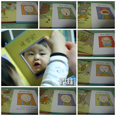 한창 아이에게 책을 사줘야한다는 중압감에 시달린 적이 있었다. 6개월 넘어가면서 슬슬 아이에게 한권씩 마련하고 있었는데 앉고 서고 웃고 하며 갑자기 성장해버렸던 7,8개월 아기가 되자 그 필요성이 더욱 커진 것이다. 전집을 들여야 하나 계속 단행본으로 때워야하던 중, 일단 단행본으로 가자 하며 골랐던 책이다. 평이 좋아서 골랐는데 이건 나도 마음에 들었다. 마지막 페이지의 거울 부분의 아이디어가 참 좋았다. 우리 아이도 그 거울이 달린 페이지로만 가면 활짝 웃는 것이다. 한 동안 이 책을 스스로 넘기며 자기 얼굴을 감상하곤 했지만 정작 이 책의 주인공의 다양한 표정 변화에는 큰 관심을 보이진 않았다. 지금은 좀 컸다고 그림이나 표정까지도 눈여겨 보지만 말이다. 어떤 그림들이 있는지 들여다 볼까?