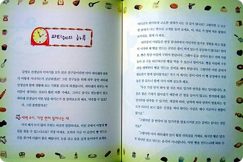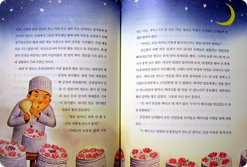 그림과 편집에도 공을 들인 흔적이 보이는데, 예쁜 케잌조각과 과자 등 꾸미기요소를 잘 활용해서 예쁜 책이라는 느낌이 들면서도 파티쉐의 뜻과 역할을 전달하는 보조도구로서 제몫을 톡톡히 하고 있다. 다만 1장에서 본문에 해당하는 그림이 다음 장으로 넘겨야 나온다는 것과 3장에서 빵 만드는 과정을 설명하고 있는데 해당 자료그림이나 사진이 없다는 것이 이 책에서 가장 아쉬운 부분이다. 글과 그림의 배치를 조금 더 신경썼더라면, 또 예쁘다는 느낌이 해치지 않도록 자료사진을 아기자기하게 넣었다면 흠잡을 데 없는 편집이었을 텐데.