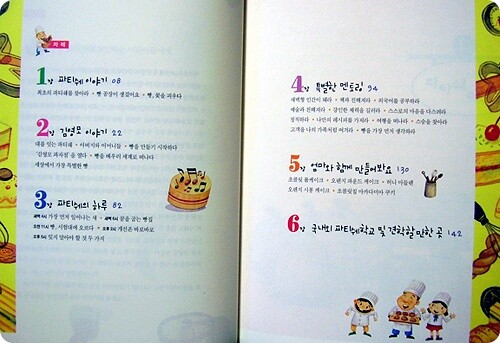 빵과 관련된 그림으로 이쁘게 디자인 해 놓은 차례~ 파티쉐와 김영모님의 이야기, 소중한 멘토링, 엄마와 함께 만들어 보는 레시피, 파티쉐 학교 및 견학할 곳 까지 총6장으로 보기쉽게 구분지어 구성되어져 있는 것을 알 수 있다.