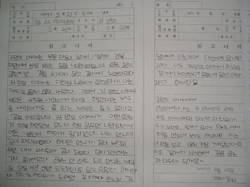 ![]() 우리 공부방 여자친구가 쓴 독후감 입니다 우리 여자친구는 공부를 잘 못해 파티쉐가 되겠다고 하네요,,,,, 그런데 김영모 파테쉐 아저씨 이야기를 듣고 많은걸 배우며 파티쉐도 열심히 공부하여 꿈을 갖는 사람이 되어야 한다면 내용을 이야기 하더라구요 우리 꼬마 친구에게 꿈을 안겨준 아저씨께 고맙다고 어린친구에세 희망을 안겨 주셨다고 이야기 드리고 싶네요 |