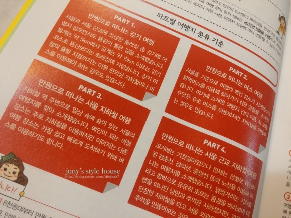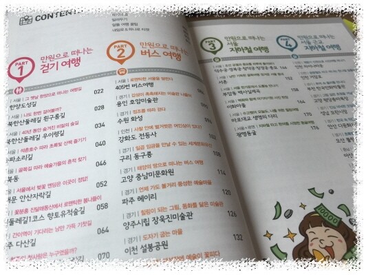 걷기여행, 버스여행, 서울 지하철여행, 서울 근교 지하철여행 이러헥 네개의 테마로 나누어 소개한다.