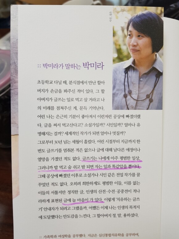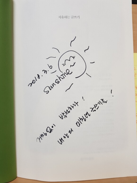[ 치유하는 글쓰기 ] -- 박 미라 글쓰기 관련 책을 읽다가 알게 되어 주문하게 되었다 앞 서두부분만 3번 정도 읽다가 제자리 걸음.... 그러다 머릿맡에 두고 큰 목차 소목차 여러번 눈여겨 보길 여러번... 했다 내자신과 이책과의 어튜먼트하는 시간이 필요했나보다 박미라 저자의 고급진 표현에 앞뒤를 왔다 갔다 언어를 음미하며 그녀만의 치유의 힘을 느껴보았다 저자는 글쓰기 치유프로그램을 진행하고 있으며 국내 정서에 맞는 치유글쓰기가 필요하다는 생각에 출간했다고 한다 치유 글쓰기가 가진 치유의 힘과 구체적 방법을 소개하고 있다 이 책을 읽으며 나는 과연 어디에 가까울까? 다른이의 실제 예시를 읽으며 치유되었던 글쓰기를 통해 자신의 방향을 관조하면 좋을 것 같다 첫 장 글쓰기, 그 치유의 힘 --치유의 힘과 구체적 방법 안내 두번째 장 온몸으로 써라 - 글쓰기 프로그(다양한 글쓰기 소재를 소개) 세번째 장은 심장으로 써라-- 치유를 위한 글쓰기 방식을 구체적으로 설명 치유글쓰기 역사는 100년에 지나지 않았으며 1950년에 시나 글쓰기로 치료성과를 과학적으로 검증했다고 한다 최근에는 다양한 논문이 나오고 있어 문학치료, 시치료등 다양한 관련 서적이 나오고 있다 ** 때로는 낙서가 당신을 구원하리라 p18 이 세상에 이유 없이 태어난 글은 없다 모두 제몫의 사명을 가지고 태어난 것이다 어떤 글은 인간 내면의 가장 높은 차원을 건드리지만 , 우리 안에 숨어 있던 어두운 측면이 활성화되도록 부추기는 글도 있다 --> 명작, 고전보다 내가 쓴 낙서들이 더 절절하게 위로를 해줄 것이다 그 낙서를 왜 했을까? 그 순간 성찰의 시간이 된다 ...종이위에 그냥 깨적깨적 떠오르는데로 적었을 뿐인데 나름 치유와성찰의 시간으로 나를 안내하고 있다 책을 읽다 보면 밑줄을 긋고 생각을 쓰며 내가 왜 이 작가의 글 중 이부분을 밑줄 긋고 내 생각을 적어야하는 거지..? 하며 사유의 시간을 갖어 본다 기억 저 편에 알 수 없는 것들이 떠오르는 것인가? 아님 애써 지우며 살았던 기억들이 작가의언어를 통해 총총 떠오르는 것인가? p240 글을 잘 쓰려면 ~해야 한다 는 원칙이나 원리를 버리고서 비로소 글쓰는 작업이 행복해졌다 그 원칙이나 원리는 내것이 아닌 남이 것이다 --> 저자 박미라의 성격을 잘 드러나는 문장이다 다듬지 않은 글을 더 좋아하고 그 글에서 자신이 더 많이 보이기 때문이라고 한다 (외부에 드러나는 경우는 고쳐 쓰고 다듬는다고 한다) 글쓰기는 이런 거야~ 작가마다 노하우를 안내하는 책들이 수천권이다 하지만 박미라의 치유하는 글쓰기는 그런 노하우하고는 목적 의미 자체가 다르다 거칠게 떠오르는데로, 욕도 그때 느꼈던 억눌렸던 서글펐던 감정을 그대로 쓰는 것이 치유하는 글쓰기의 본질이라고 말한다 알 수 없는 막혀 있던 자아의 아픔들이 떠오르는데로 쓰다 보면 자기 안의 미움과 분노를 해소할 통로가 되는 길이라고 말한다 다듬어 지지 않는 그 서민적 글들을 쓰면서 치유가 되고 읽는 이들에게도 더 깊은 치유의 시간이 된다고 말하고 있다 글을 잘쓰기 위해선 내 말을 들어! ~하는 작가들의 글하고는 어떤 형식틀에 얽매이지 않을 때 내면에 솟구치는 욕망의 글쓰기로 자연스레 성숙한 글부림(몸으로 쓰는 글)으로 연결 될 것이다 필자의 경험을 통해서도 말하고 있다 나도 그렇다 ~이렇게 쓰면 않되고 ~ 하면서 특히 부정적 말을 쓰면 않된다고 말하는 작가들도 있다 그래서 치유 글쓰기는 일반 글쓰기 보다 치유가 목적이기때문에 일반적 글쓰기 노하우를 따라 하다보면 치유글쓰기의 발설이 생각들만 맴맴 돌게 할 뿐 치유 글쓰기로 연결되기가 어렵다 저자의 글쓰기 방법중에 미친년 글쓰기가 있다 남녀 불문하고 미친년 글쓰기를 권한다 미친년을 만드는 사회에 대한 통찰에서 시작한다 획일적인 사회, 일반적 사회구조에서 벗어날때 비정상, 다름이 많음, 약간의 똘끼는 그런 미친 존재가 된다 미친년 글쓰기는 그런 세상에 발설하는 글쓰기이다 내가 다르다는 것을...세상의 잣대에 평범한 삶이 아닌 것을 스스로 드러내고 인정하는 글쓰기이다 나 이런 사람이야~~ 하고 말이다 박미라 작가는 그런 글쓰기가 의식과 무의식이 화해하는 글쓰기라고 말하고 있다 미친년 글쓰기에서 의식과 무의식의 경계가 허무는 것이다라고 말하고 있다 단 작가는 비공개와 공개의 선을 지켜야 한다고 있다 나 혼자 비공개로 써도 충분히 치유의 출발이며 치유의 완성이라고 말하고 있다 공개적으로 쓰고자 할때는 충분히 본인이 감당할 에네지가 될때 공개하라고 한다 그밖의 글쓰기 프로그램중 ~ 죽도록 미운당신에게 셀프 인터뷰:나에게 나를 묻다 떠나보내기; 충분히 사랑한 것은 떠나간다 부분은 나에게 야단치는 깐깐한 나에게로 해방된 기분이다 ** 발설이 그대를 구원하리라 ** 감정에 치우치기 보단 이해하기 쉽게 쉬운 말로 내 삶을 쓰자 언젠가 나의 가족.아들이 읽을 테니 말이다 ♡ 심리 치유에 관한 이야기 ♡ ♡♡♡감사합니다 사랑합니다 축복합니다♡♡♡♡