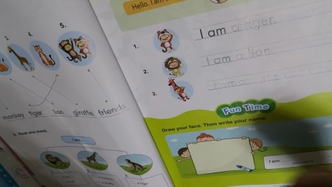 씨디들었던 것들을 조합해서 문장을 만들었어요 I am Sam. I am a tiger. 실은 다음장 리딩이 이런것들이기에 미리 본 저는 미리 좀 시켜봤답니다. 그냥 저냥 하더라구요 뭐지??하는 어리둥절함과함께요