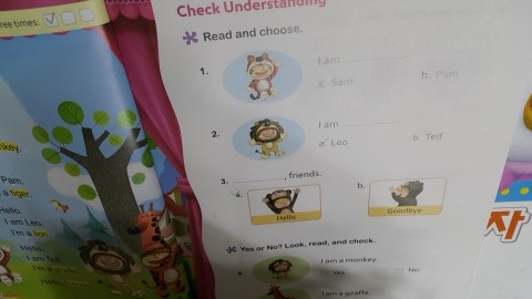 첫장엔 6개의 단어가 나와요 hello friends monkey tiger lion giraffe