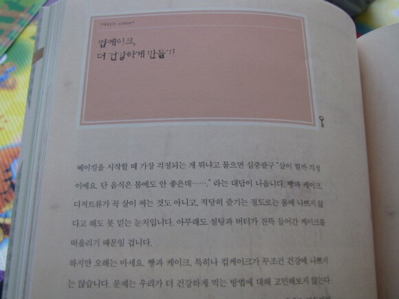 그렇게 꿈에 부풀어 또 한권의 예쁜 베이킹 북을 만났습니다. 뉴욕 여행 책에 심취하다보니, 컵케이크에 열광하게 되어서(뉴욕에 꽤 유명한 컵케이크 전문점이 많다더군요.) 저도 모르게 먹어보지도 못한 컵케이크를 꿈꾸게 되었더랬지요. 너무나 달다는데, 그래도 꼭 먹어보고 싶었어요. 마땅한 판매처를 찾지 못하다보니 그럼 내가라도 만들어 볼까? 하는 생각이 들게 되었고 그때 만나게 된 책이 바로 이 책, 컵케이크& 디저트랍니다. 일반 빵은 반죽기가 있어야 하는데, 컵케이크의 기본이 되는 머핀 같은 경우에는 반죽기 없이도 만들 수가 있어서 저같은 초보 주부도 손쉽게 도전할 수 있을 것 같아요.