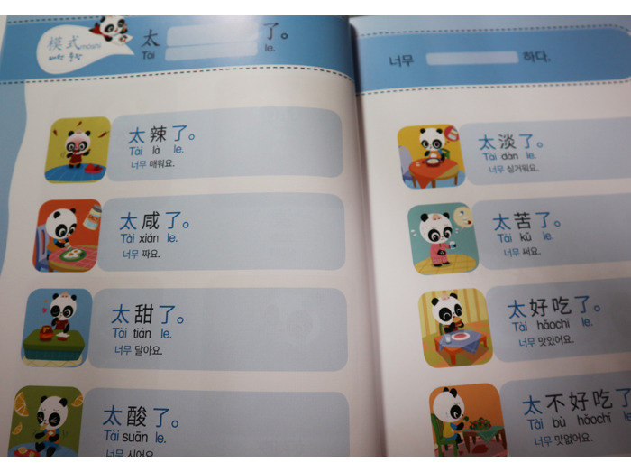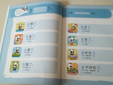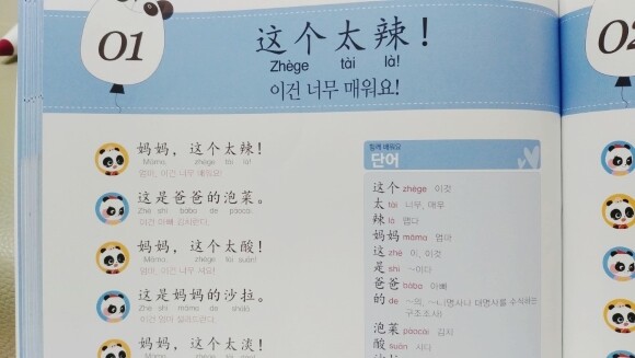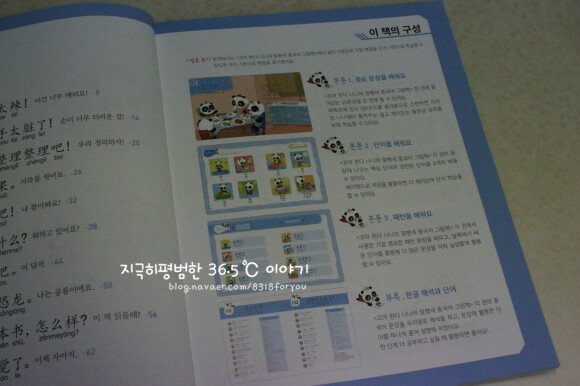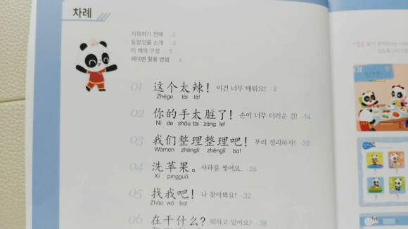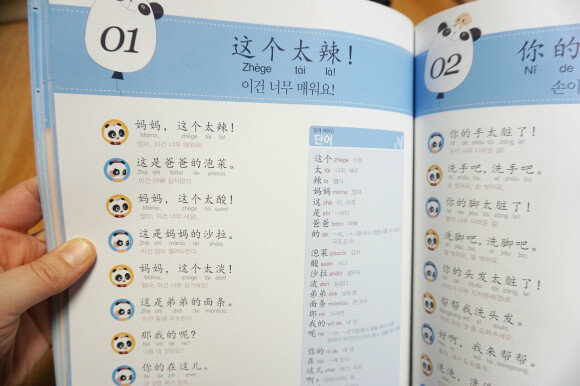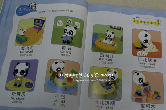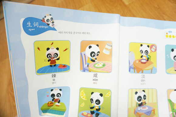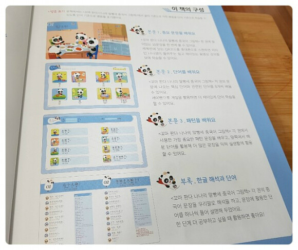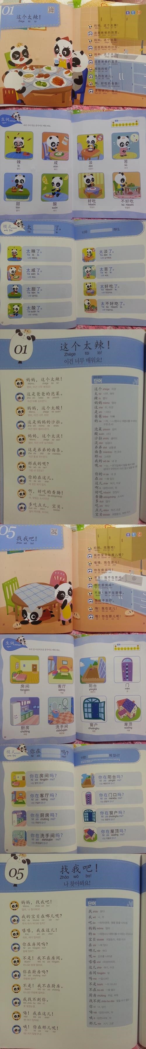 많이 쓰이는 중국어 단어와 패턴으로 이루어진 교재이고 세이펜활용, mp3 파일도 있어요. 귀여운팬더 그림에 병음표기도 잘 되어있네요 세이펜이 있어서 콕콕 찍어 활용할 수 있고 게임도 있어 반복하며 재미있게 학습할 수 있어요. 뒤쪽엔 친절하게도 한글해석본이 따로 정리되어 첨부되어있어요.? 주요 단어들도 보기 편하게 잘 정리되어있어요. 엄마표로 하기에 좋은 교재네요. |