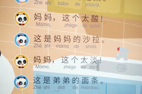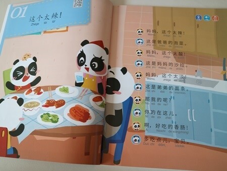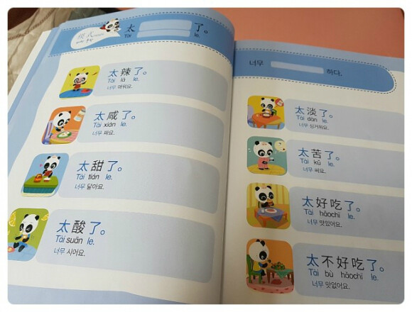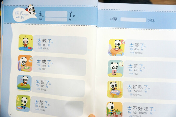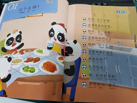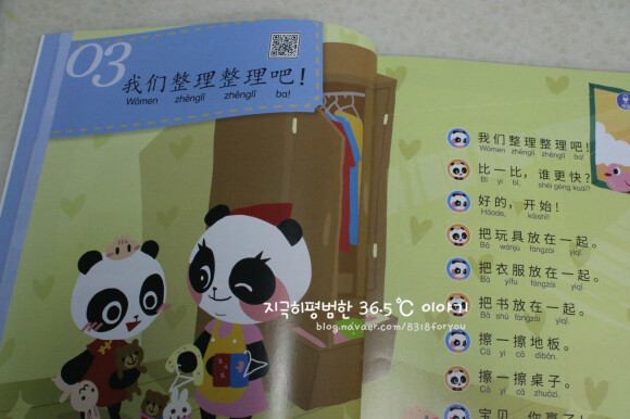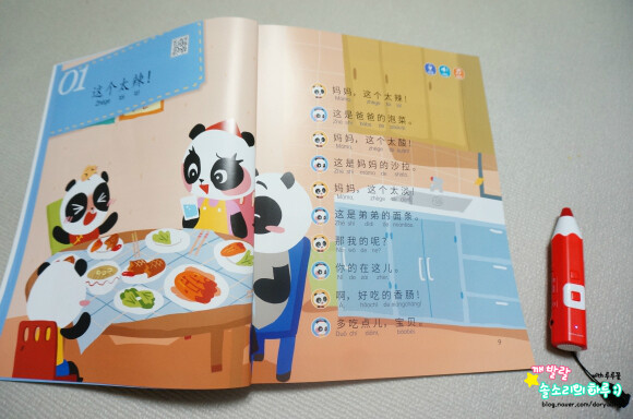 유치원에서 중국어를 배웠다면서 OO을 뭐라고 하는 줄 아느냐고 엄마에게 묻는 아이를 보며, '나도 중국어를 해야하는구나' 하는 마음을 가지고 있었어요. 엄마는 모든 것을 다 알고 있다고 굳게 믿는 아이에게 '엄마 중국어 몰라'의 고백은... 곧 '너도 중국어 몰라도 돼'나 마찬가지였을테지요. 중국어는 너무 어려워서 엄두가 안났었는데, 아이를 위해서 중국어 교재를 하나 준비해볼까 생각했지요. 그러던 중에 만난 책이 바로 이 책이예요. 말빵세, 말빵세 하면서 수년 전부터 인기를 끌었던 바로 그 시리즈에서 영어 뿐만 아니라 중국어를 접할 수 있게 되었어요. 바로 <꼬마 판다 나나의 말문이 빵 터지는 세마디 중국어>인데요, 중국어를 처음 만나는 엄마와 아이를 위해서 판다 가족의 이야기 속으로 들어가볼까 해요. 주인공 나나와 엄마, 아빠, 남동생 당당, 그리고 만두요정들이 이 책의 주인공이랍니다. 저녁 식사를 하고, 정리하고, 놀이 하고, 이 닦고, 책 읽고, 잠자는 아이의 일상이 들어 있는 책이예요. 저녁 식사를 하면서, 김치를 먹은 나나는 맵다고 해요. 샐러드는 너무 시네요. 동생거는 싱거워요. 엄마아빠는 나나를 위해 소시지를 준비했지요. 우리 아이의 일상에서 일어나는 일 그대로죠? 아이가 나나와 동일시 하면서 나나가 하고 싶은 말이 자기의 말이 되면서 쉽게 쉽게 중국어를 익힐 수 있게 되는 거죠. 이 페이지에는 QR코드가 들어 있어서 아이와 함께 책의 내용을 중국어로 듣기 편하게 만들어져 있어요. 세이펜으로 해도 되고, QR코드로 해도 되니 정말 편하네요. 책을 들고 외출 할 때도 QR코드를 통해 접할 수 있거든요. 맵다, 짜다, 싱겁다, 쓰다, 달다, 시다, 맛있다, 맛업다. 아이들이 표현할 수 있는 맛에대한 표현이 가득하니, 아이가 우리 집 밥 맛을 엄마에게 중국어로 말해주기를 기대해도 되겠지요?