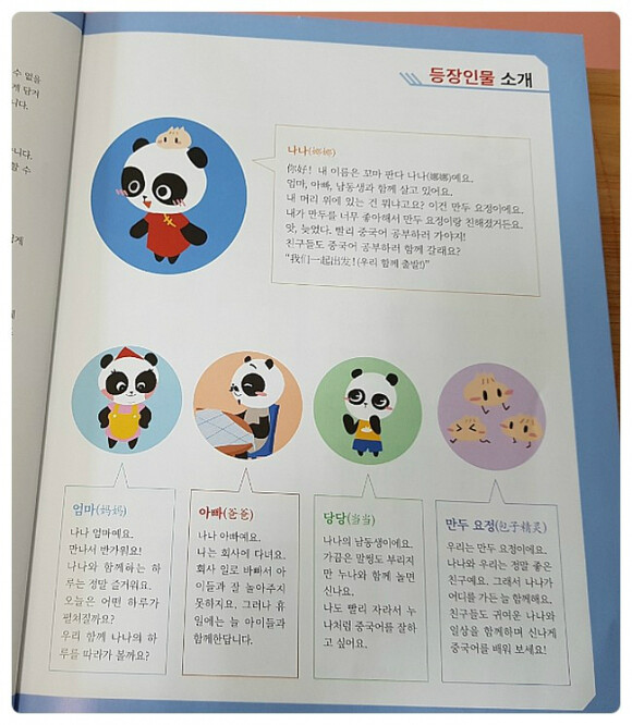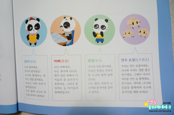 중국어의 기본인 한자! 한자라서 괜히 더 복잡해 보였던건 사실인데요. 짧고 쉬운 문장으로 구성되어 있다고 하네요. ![]() 이 책의 주인공들. 아무래도 아이의 눈높이에 맞추어 가족, 친구로 구성되어 있어요. 또, 아이가 쉽게 접근할 수 있는 동물이 주인공! 그 중 중국 하며 떠오르는 판다가 선택되었어요. 중국의 의상을 입고 있는 나나가 이 책의 메인 주인공이에요 :) ![]() 이 책은 어떻게 구성되어 있는건가 하고 먼저 살펴보았는데요. 일단 상황극과 문장들. 문장으로 한 번 훑고 지나가구요. 문장에 쓰인 단어들, 그리고 패턴을 배워요.