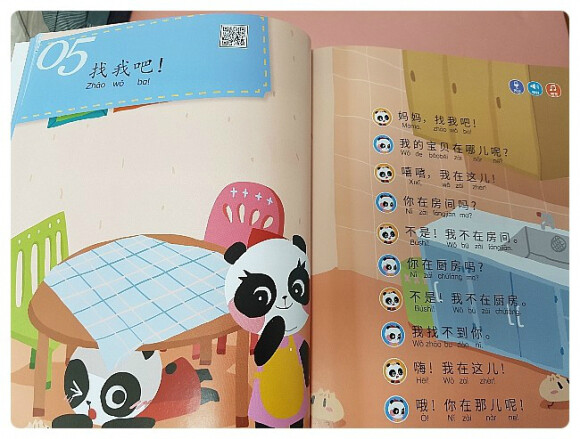 5과에는 나나가 엄마와 숨바꼭질 하는 장면이 나와요. 밥 먹고 나서 엄마와 잠시 노는 것, 나나와 우리 아이들 똑같지요? 숨바꼭질을 통해서 우리 집의 방, 거실, 주방 등 장소에 대해서 알아봐요. 우리집의 이곳 저곳을 알아야 어디서 무얼 했는지 이야기 할 수 있겠지요? 방, 거실, 화장실, 창문, 문 등 집안의 여러가지 장소를 중국어로 말해볼 수 있어요. 이와 동시에 아이와 숨바꼭질도 해 줘야 한다는 사실^^ 패턴 문장 "너는 ~~~에 있니?" 인데요, 역시나 단어를 알았으면 문장을 만들어 보아야겠지요? 말빵세의 기본 패턴 문장이예요.
