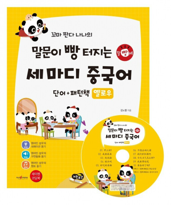 꼬마판다 나나의 말문이 빵 터지는 세마디 중국어는 단어와 패턴책으로 옐로두 / 레드 / 블로 3종으로 구성되어 있는데 시간의 흐름에 따라 아이의 하루 생활에 맞춘 일상중국어로 이루어져 있어요.