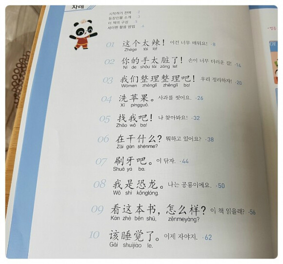노란우산 꼬마판다 나나의 말문이 빵 터지는 세마디 중국어- 블루 엄마표 중국어...라고 하기엔 제가 해주는 건 별로 없고ㅋㅋ 서원양이 중국어 소리를 좋아해서 중국어 동요, 기초 생활 중국어를 노출할 수 있게 기회만 주고 있습니다 블로그를 운영하면서 아이를 키우고있는 중국어 선생님 나나샘이 만드신 중국어 패턴.단어책인 말빵세 세마디 중국어 -블루- 옐로우/레드/블루로 구성된 시리즈인데 알고보니 레벨별로 나뉜게 아니고 아이의 일상 생활에서 가장 많이 사용하는 짧은 문장을 아침,오후,저녁시간으로 구분했더라구요...즉! 블루는 저녁시간^^