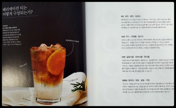 이렇게 다양한 종류의 재료들이 있지만 저자는 우리가 시중에서 손쉽게 구할 수 있는 재료들로 레시피를 소개해 주었기 때문에 기본적인 재료만 갖춘다면 간편하게 '베리에이션 티' 를 즐길 수 있다. 베리에이션 티에 들어가는 재료를 중심으로 기본적인 설명을 한 뒤에 티를 만드는데 필요한 도구들 역시 하나 하나 친절하게 소개를 하고 있기 때문에, 책만 찬찬히 읽어보면 초보자도 쉽게 따라만들 수 있을 정도로 이해하기 쉽다. 녹차와 홍차, 허브티 베이스로 목차를 나눠서 메뉴를 소개하고 있기 때문에 좋아하는 티를 베이스로 한 레시피를 찾아보기도 쉽게 되어 있다.