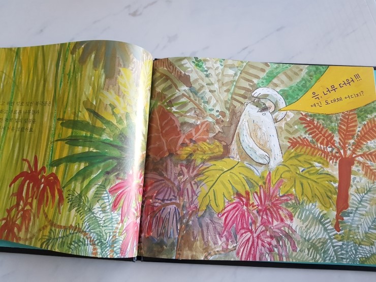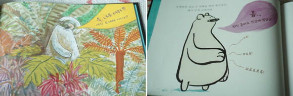 북극곰이 간신히 몸을 지탱할만한 빙하를 타고 도착한 곳은 아름다운 정글이에요. 북극곰은 난생처음 보는 곳인데다 자신이 살던 곳과 완전히 다른 환경이라 여간 당황하는 게 아닙니다.