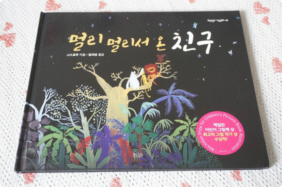 보랏빛소 그림동화 5번째 이야기♥ [월요일은 빨래하는 날] [여섯마리 눈먼 쥐와 코끼리] [엉덩이 날씨] [잠들기 전 뽀뽀 100번 ]에 이은 [멀리 멀리서 온 친구] 역시 읽으면 마음이 따뜻해지는 동화입니다. [멀리 멀리서 온 친구]는 J.H.로우 작가의 작품으로 이번 작품에서도 공자의 명언을 유머러스한 그림으로 즐겁게 풀어 아이들에게 친구의 소중함을 이야기해주고 있어요. 이번 작품으로 맥밀란 어린이 그림책상에서 최고의 그림 작가상도 수상했다고 하네요. 어느날 아름다운 정글에 도착한 낯선친구 흰 북극곰이 태어나서 처음 보는 푸르른 나무들과 녹색빛의 덤불속을 거닐며 이야기는 시작됩니다. 긴 여행동안 배고파진 북극곰은 바나나도 먹어보지만 맛도 없고 물속에서 사냥도 해보지만 오히려 쫓기는 신세가 되요. 북극곰은 그리고 처음 보는 친구들을 발견합니다. 하이에나 ,사자 그리고 표범." 안녕?하얀 친구!" 세친구는 북극곰에게 사냥하는 법을 가르쳐 주고 함께 배불리 먹지요.그리고 북극곰을 정글에서 가장 좋아하는 장소로 데려갑니다. 북극곰은 아주 멀리 있는 고향을 알려주고 왜 이곳까지 오게 되었는지 이야기 합니다. 그리고 친구들은 말합니다. "슬퍼하지마, 북극곰아! 고향으로 돌아갈 수 있도록 우리가 도와줄게!" "그래, 하얀친구! 함께 찾아보면 분명 방법이 있을거야!" 페이지 마다 펼쳐지는 수묵담채화속에 환하게 웃고 있는 동물친구들 모습에서 박수가 절로 나오는 작가의 표현력에 감탄합니다. 글밥도 적고 그림도 단순해 보이지만 작가가 전하고 자 하는 마음은 읽을때마다 깊고 무겁다는 생각을 했어요. 저희 집 삼 남매는 3가지 독후 활동을 해보았어요. 1.有朋自遠方來, 不亦樂乎(유붕자원방래, 불역락호) : '벗이 멀리에서 찾아오니 즐겁지 아니한가!' 한자뜻 찾아보기. 그 속 뜻을 각자의 생각으로 풀어보기. 한자로 한번 써보기 2. 멀리서 온 벗에 대해 생각해보기: 전학생, 관광객, 해외이주민 그들과 함께 즐거움을 나누는 방법 3. 뒷 이야기 상상하여 만들어보기: 펭귄을 만난 북극곰의 남극생활 환경운동가가 되어 온 세계를 돌아다니며 에너지 절약을 외친 북극곰... 첫 페이지의 '지은이의 말'에서 작가는 독자들이 같이 생각했으면 하는 부분까지 안내해줘요. 마지막 페이지의 '옮긴이의 말'은 친구라는 선물로 가득찬 세상이라는 상자에 대해 생각하게 해줍니다. 이렇게 생각장치들이 있으니 아이들과 독후활동지도에 큰 도움이 되었어요.