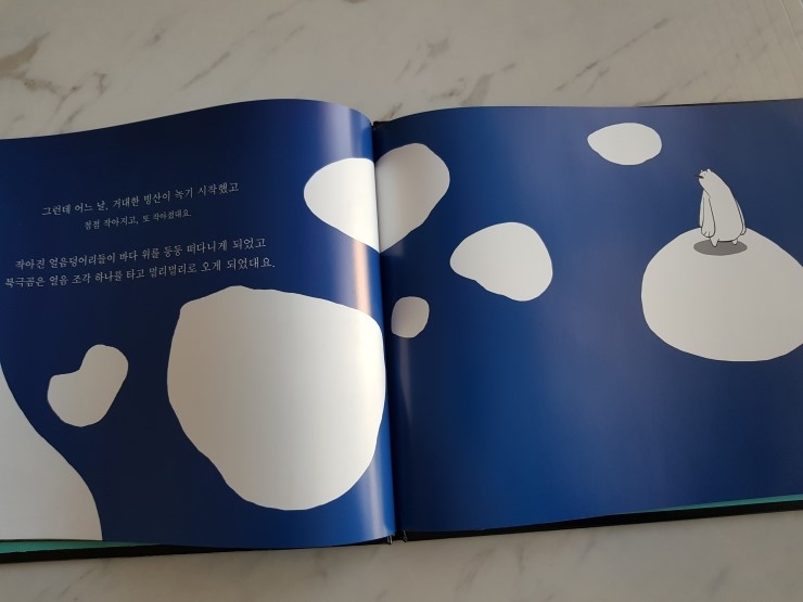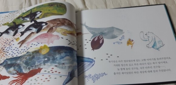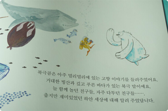 북금곰은 아주 아주 멀리에 있는 고향이야기를 들려주지요. 거대한 빙산과 깊고 푸른 바다가 있는 북극 이야기지요.