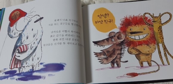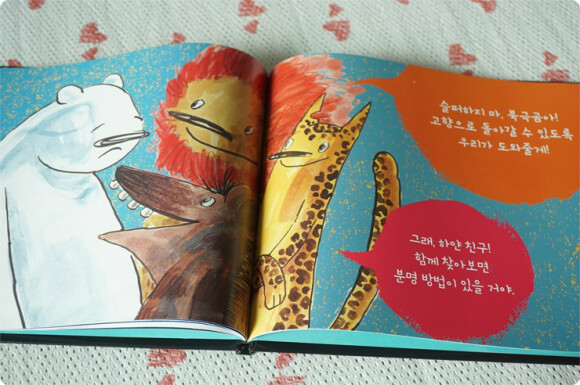 ![]() 처음먹어보는 바나나가 적응이 안되는지 괴로워 하는 귀여운 북극곰~~ ![]() 헤어드라이어가 왠지 어울릴것 같지 않은 북극곰과 익살스럽게 생긴 동물 친구들~ ![]() 별과 이야기를 좋아하는 친구들~ 북극곰에게 용기주는 친구들~ 그림책 한장한장이 너무도 귀엽고 따뜻하다. 북극곰은 친구들 도움으로 무사히 고향으로 돌아갈수 있을까? "고마워, 친구들아! 잊지 않을게!"란 북극곰의 말로 이야기는 끝이 난다. ![]()