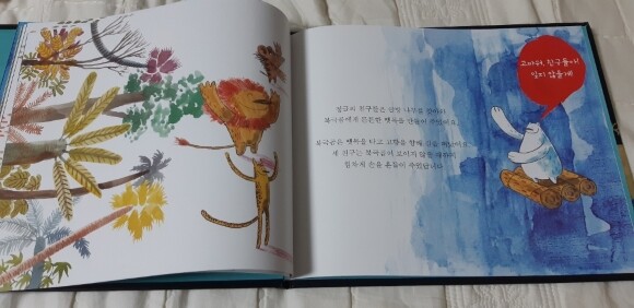 그리고 북극곰이 이 먼 정글까지 오게 된 까닭이 빙산이 녹기 시작해서라는 사실도 들려줍니다. 정글 친구들은 의도치 않게 고향을 떠나 먼 곳으로 오게 된 북극곰을 위로하며, 고향에 돌아갈 수 있는 뗏목을 마련해 줍니다.