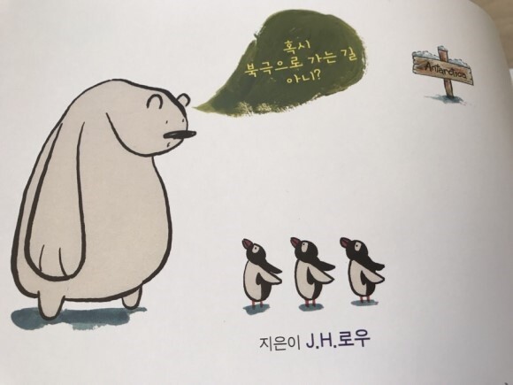 그림책은 그렇게 끝이 나고, 북극곰이 고향에 도착했는지가 너무 궁금할 무렵, 뒷장에 북극 푯말 옆에서 북극으로 가는 길을 묻는 일러스트가 보입니다. 그리고 옆 장엔 북극곰이 후라이팬에 생선을 올려 뒤집개로 뒤집으려는 그림도 보이죠. 부실해 보이는 뗏목을 타고, 홀로 고향을 찾아가는 북극곰이 못내 걱정되었는데, 작가는 해피엔딩을 이렇게 보여주고 있네요. 면지를 사용하는 작가들 덕분에 아이들이 그림책을 꼼꼼히 살피게 되었는데요. 이 책에도 뒷장까지 찬찬히 들여다보지 못했다면 놓쳤을 이야기라 펼쳐져 반갑더라고요.