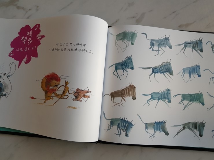 딱 봐도 북극곰이랑 입맛이 비슷하게 생겼어요, 그쵸?!? 하이에나, 사자, 표범이 정글의 사냥법을 알려줘서 죽어라 뛰고 또 뛴 후에야 사냥에 성공! 배불리 먹고 표지의 멋진 장소에서 대화를 나눠요.