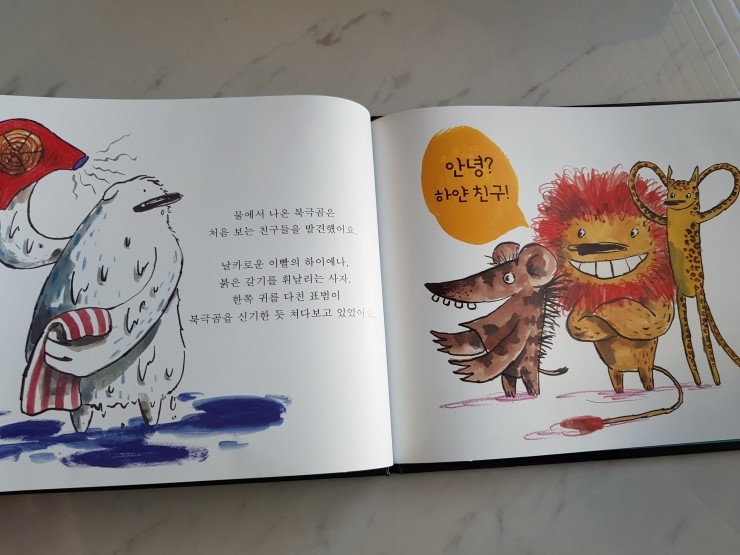 먹이를 찾던 북극곰 앞에 하이에나와 사자, 표범 친구가 찾아왔어요. 안녕? 하얀 친구! 라면서요. 북극곰과 세 친구들은 이야기를 나누며 어느새 다정한 친구가 되었어요.
