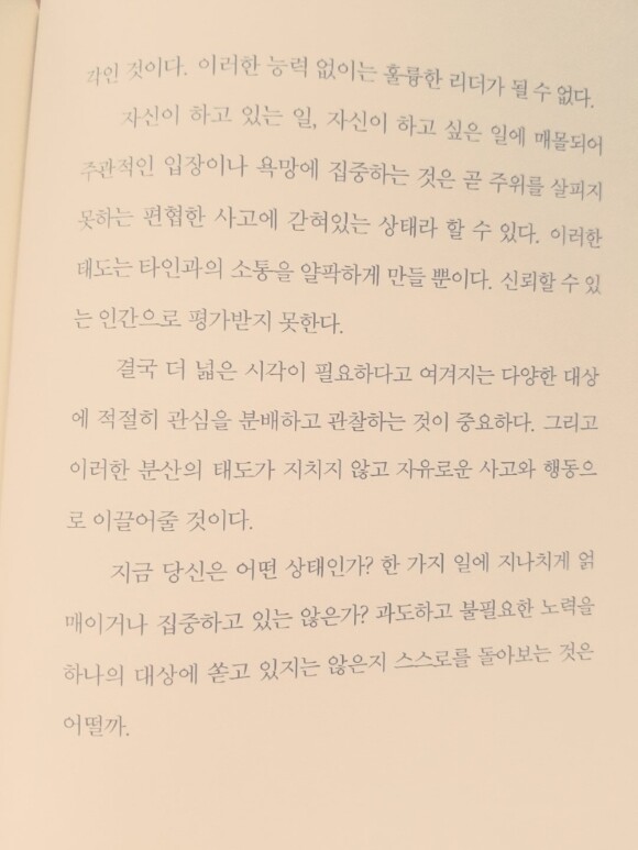 무엇보다 나는 우리가 집중해야 한다는 강박에서 해방되었을 때 기계가 해내지 못하는 인간 본연의 능력을 발휘할 수 있다는 것을 이야기하고 싶다. (p.10) 집중사고는 과거 산업혁명 시대의 공장에서나 요구되는 소양이다. 오늘날에는 단순 작업의 대부분을 인간이 아닌 컴퓨터가 대신한다.