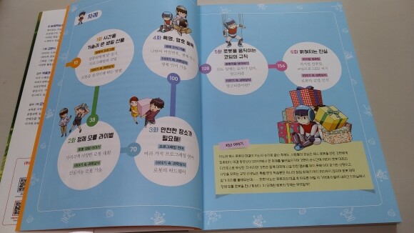 차례를 먼저 볼까요? 컴퓨터에 말을 걸고 로봇을 움직이게 하는 방법도 나와있네요. 저의 앤 아직 컴퓨터를 켤 줄을 모르지만 게임을 한다거나 유튜브를 보는 게 전부죠. 여러 가지 프로그래밍 언어를 잘 이해할지 기대가 되네요.