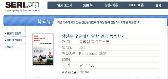 이렇게 찾아오게 된 건 <당신은 구글에서 일할 만큼 똑똑한가> 다소 건방진(?) 제목의 타임비즈의 신간이 삼성경제연구소(seri.org) 북리뷰 코너에 소개되어 혼자 보기엔 아쉬운 마음에......☞☜ 고현숙 대표님의 간략하게 잘 정리된 요↓리뷰를 공유하고자 찾아왔습니다.