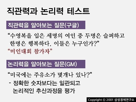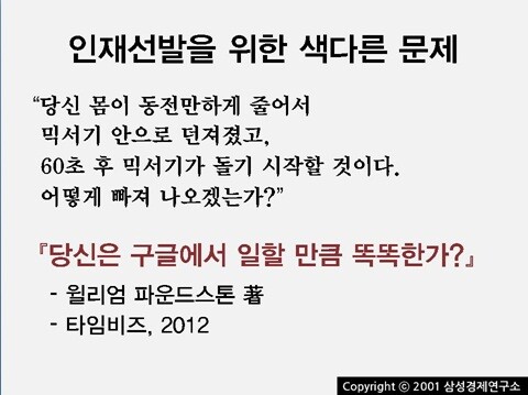 뭐든 좋은 말은 다 써다 붙인 것 같지만 사실이 그렇다. '동전 크기로 작아진 채 믹서 속에 빠진 사람이 60초 내에 빠져나가는 방법'에 답하기 위해서는 가지고 있는 모든 기발함을 논리적으로 포장할 수 있는 능력이 있어야 한다. '캘리포니아에 몇 명의 환경미화원이 있을까?'라는 애플의 질문에 답하기 위해서는 캘리포니아 인구도 대강 알아야 하고, 환경미화원의 비율에 대한 어느 정도의 감각도 필요하다. 또 어떤 문제는 고전적인 퀴즈나 아주 초창기 수능, IQ 테스트에나 나올 법한 질문도 있으니 이왕이면 똑똑해야 할 것 같다. 그리고 대부분 즉시 떠오르는 답은 틀리기 마련이니 급하게 대답하는 습관도 없애야 할 지 모른다.