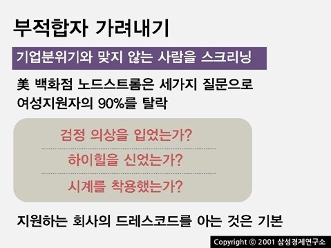 시장이 호황이던 90년대 후반만 해도 사람을 잘못 채용한다 해도 치러야할 대가가 적었고, 회사와 맞지 않아 다시 고용시장에 나온다 해도 갈곳은 널려있던 분위기 였단다. 허나 2008년의 금융위기를 거치면서 직원들은 어떻게든 회사에서 버티려고 발버둥 친다. 능력이 없을수록 거머리처럼 달라붙는 힘은 더 강해진다. 결국 해고와 고용 모두가 어려워진 상황에서 이런 까다로운 검증절차를 만든것이 아닐까? 이 책을 보며 결국 우리의 상황이나 외국의 상황이 별반 차이가 없다는 것을 알았다. 모두가 갈망하는 기업에 들어가기 위해서는 높은 토익점수, 봉사활동,해외어학연수경험,자격증 그리고 출신학교. 단지 몇가지 방법만 다를뿐 입사를 위한 방법은 구글이나 한국의 기업들이나 별반 차이가 없다는 것을 느꼇다.