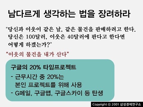 [그런 질문들의 교훈] 이제 이런 질문들은 우리 나라 기업들의 면접에서도 어렵지 않게 찾을 수 있다. 그럼 창의적인 인재를 뽑고자 하는 그들의 열망에 걸맞는 기업 문화를 만들었을까? 잘은 모르지만 여기저기서 들리는 목소리는 그렇지 않은 것 같다. 물론 대한민국 경제나 기업이 잘 굴러가는 걸 보면 기업 경영을 잘 한다고도 할 수 있겠지만 적어도 '창의성'이라는 지금 시대가 요구하는 가치에 부응하지는 않아 보인다. 이건 마치 아주 능력있는 고등학생들을 그냥 괜찮은 대학생들로 만드는 대한민국의 대학교들과 똑같다. 셔플댄스를 배우는 부장님을 광고할 게 아니라 회식 자리에서 셔플댄스를 춰도 되는 회사로 바꿔야 하는 이유와도 닿아 있다.