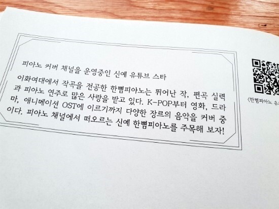 책을 펼치고 더듬더듬 연주를 하다가 큐알 코드를 통해 연주영상을 확인해보았는데요. 연주를 배우고 싶어서 동영상을 재생했지만 그 연주에 푹 빠져서 어느 덧 감상을 하게 되더라구요.
