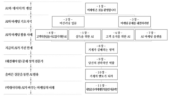 이 책은 11장으로 이루어져 있다. 1장 마케팅의 미래 소개 2장 머신러닝 입문으로 데이터 과학자와 마케팅 전문가 2장을 읽어야 할 이유 3장 마케팅 문제 해결하려면 4장 고객의 관심을 사로잡기 위한 AI 5장 설득을 위한 AI 6장 고객 유지를 위한 AI 7장 AI 마케팅 플랫폼 8장 기계가 실패하는 영역 9장 당신의 전략적 역할 10장 기계의 멘토가 되어라 11장 내일은 우리에게 무엇을 안겨줄까?