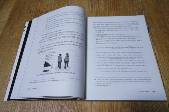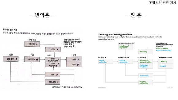 반면에 아쉬운 부분도 있었다. '9장. 당신의 전략적인 역할' 챕터에서 사례로 소개하고 있는 '통합적인 전략 기계' 다이어그램에서 보면... 구글에서 찾아본 원본(영문본)과 한글 번역본(이 책)의 차이 때문에 이해하기 어려운 부분이 있었다. 원본은 컬러본이라 '인간의 역할과 기계의 역할'이 명확히 구분이 되어 있는데... 한글 번역본의 경우는 컬러를 그레이 스케일로 색상 변경을 해서 '인간의 역할과 기계의 역할' 구분이 시각적으로 구분되지 않는다. 내가 갖고 있는 책은 직접 표시를 해서 구분할 수 있게 해두었지만... 약간 번거롭긴 했었다. 물론, 다른 사진들의 경우는 이렇게까지 구분이 어렵진 않아 다행이긴 한데... 책 디자인할 때, 이런 부분은 조금 더 신경을 써줬으면~ 한다.