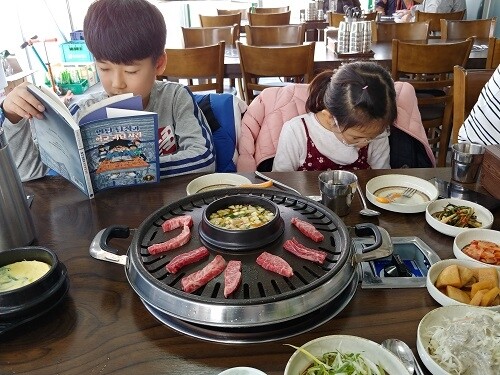 고기인증샷인지 책인증샷인지는 헷갈리는 사진이지만 괴담 으스스스 낮에만 읽고 있어요. 저도 보면 은근히 무서워서 밤에 보면 아무래도 잠을 못잘것 같아서요 하지만 아이는 무서워하면서도 엄청 좋아하는 책이 바로 별난탐정과 학교괴담사건입니다. 그래서 이렇게 외식하려고 나왔는데도 고기가 익어가는 틈을 타서 책을 읽고 있죠? 읽고 또 읽어도,,, 무서운 이야기는 역시 중독되나봅니다 계속 읽고 싶어해요!!