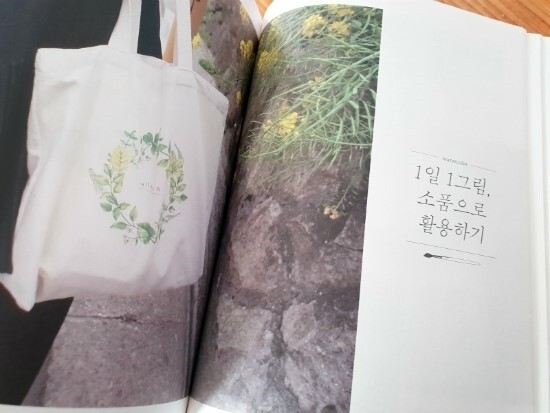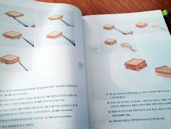 책에서는 과정샷을 꼼꼼하게 보여주고 있는데요. 샌드위치 하나를 완성하기 위해서 13컷의 과정그림을 보여주고 또 어떤 물감의 어떤 색을 사용했는지 예시해주고 있어서 도구사용에도 참고가 됩니다. 위에 목차를 살펴보면 아시겠지만 봄, 여름, 가을, 겨울의 그림 뿐만 아니라 여행중 그림, 동영상, 소품활용 등에 대한 정보도 함께 실려있어서 혼자서 매일 매일 취미생활하기 딱 좋게 좋은 정보들을 많이 제공해주고 있는 감사한 책이에요. 특히 소품활용부분에서는 컴퓨터를 활용하여서 어떻게 소품에 활용하는지 자세하게 알려주고 있어서 정말 내 그림을 소품에 활용할 수 있을 것 같습니다. 저도 제가 연습한 그림으로 엽서나 카드를 만들어 보려구요.