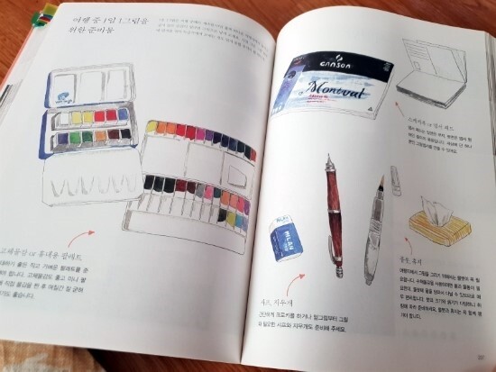 책에서는 1일 1그림을 위한 준비물 소개를 해 주고 있는데요. 300g 이상의 스케치북, 세 가지 굵기의 기본 붓, 24색 물감, 색상수에 맞는 팔레트, 푸딩용기를 써도 되는 물통, 고체물감 12색과 물붓, 샤프 지우개 등 자세하게 어떤 준비물이 좋은지 설명해주고 있어서 재료준비하는데에도 도움이 됩니다. 아직 저는 200g정도의 종이와 집에서 아이들과 함께 사용하는 물감과 파레트를 사용하고 있지만 조금씩 조금씩 저를 위한 재료들을 구매해보고 싶은 마음이 생기더라구요. 기본적으로 드로잉에 대해 물감으로 만들수 있는 색상, 그라데이션, 음영연습 등 기본적인 방법들을 먼저 알려주고 난 후 본격적인 실습에 들어갑니다.