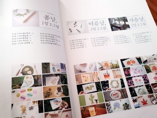 엄마의 그림시간 다음으로 구입한 1일1그림♡♡ 이번엔 계절에 따라 나누어진 주제별로 그려보는 수채화책이다. 하나의 주제마다 그리는 세세한 방법과 물감, 붓크기까지 친절하게 나와있어서 몇번 따라그리다보면 꽤 그럴싸하다. 색감도 다양해서 필요한 물감들을 하나씩 사모으는 재미도 있고 부담느끼거나할만큼 어렵지 않아서 책이름처럼 하루한개씩 그리면 어느새 수채화실력이 많이 늘것같다.