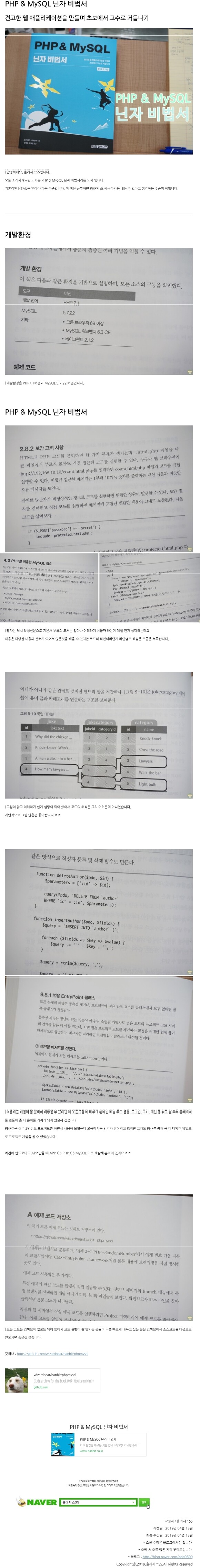 샘플이 죄다 영문인데 설명엔 한글로 적혀 있고, 따라서 하다보니 한글은 깨져 나오고. 뭐 그런 수순이었죠. 책의 어디에서도 MySQL 설정환경에서 처음 Schema 생성시 Default Charset을 utf-8로 해두라는 것이 없어서 테이블을 생성해서 실행할때 에러가 나는 문제로 잠시 방황을 했었습니다. SHOW CREATE TABLE 테이블명; 위 명령어로 테이블을 조회해서 인코딩정보를 확인한 후 CONVERT character 명령어를 통해 utf8로 변환시켰습니다. ALTER TABLE 테이블명 CONVERT TO character SET utf8; 다음부터는 한글로 입력해도 제대로 실행되었습니다. 다행히 오래 시간은 들지 않았지만 이렇게 또 한가지를 배웠습니다. 번역의 아쉬움'4.7 확장성 예측 장'의 시작은 다음과 같습니다. 지금까지 실습한 예제는 페이지의 모든 HTML을 jokes.html.php 템플릿에 넣었다. 그러나~ 문맥상으로만 보자면 "지금까지의 예제는 jokes.html.php 템플릿에 넣으면 동작하는 것을 확인할 수 있다. 그러나~" 정도가 이해가 쉬울 것 같다는 생각이 들었습니다. 아쉬운 부분이라 생각됩니다. 감상평첫 시작이 좀 아쉽다는 생각이 들긴 했지만 공부하는 데는 좋다는 생각이 들었습니다. 오류를 해결하다 보면 실력이 조금씩 늘긴 하죠. 어찌보면 좋은 방향일지도 모르겠습니다. 지금까지 초보를 대상으로 하는 PHP 서적을 몇 권 접해 봤습니다만 PHP & MySQL 닌자 비법서는 초보자에게 읽어야 하는 부분이 상당수 있어서 난도가 있다고 여겨지는 부분도 있었습니다.