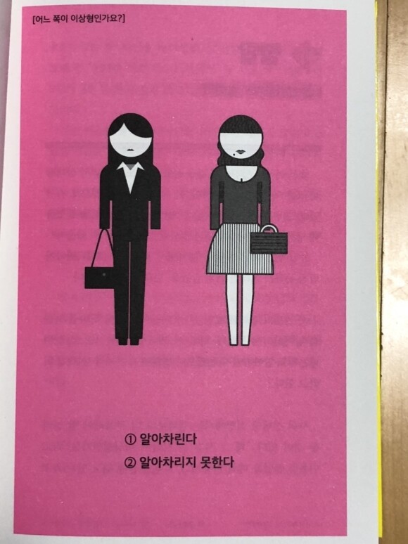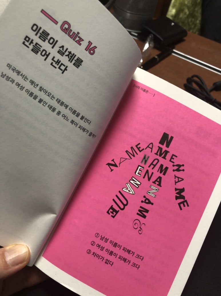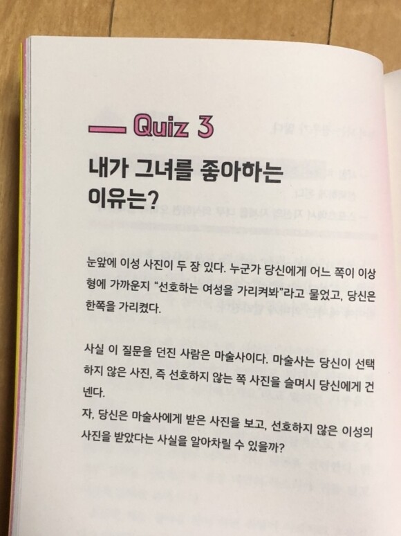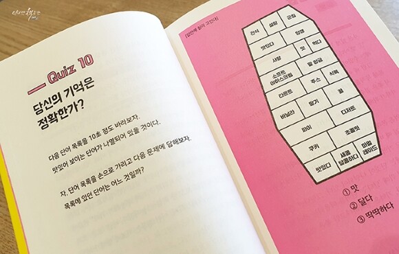 1) 책의 전반적인 구성 뒤에 부록처럼 속해 있는 착시용어 50개와 인지편향용어 225개에 대한 간단한 사전식 설명을 제외하고도 이 책의 전반적인 구성은 매우 단순하다. 실생활에서 쉽게 접해볼 법한 상황이 주어지고, 이 상황에서 어떻게 행동할 것인가에 대한 선택지를 고르는 방식이다. 이에 대한 해설은 바로 뒷장에 이어진다. 사실 처음 이 책을 읽었을 때는 조금 당황스러웠다. 마치 내가 어릴 적 읽던 수수께끼 집과 별반 다르지 않았기 때문이다. 하지만 읽다보니 이와 같은 구성은 독자들로 하여금 짧은 호흡으로 책을 가볍게 읽을 힘을 실어주었고, 어떻게 보면 어려울 법한 뇌 상식들과 각종 전문용어들을 그 속에서 자연스럽게 습득할 수 있게 만들었다. 작가 역시 이러한 구성에 대하여 ‘가벼운 형식을 취하고 있지만, 내용은 지극히 전문적이다.’고 말하고 있다. 어려운 내용이라면 질색하는 내가 책장을 술술 넘겼다는 건 이러한 저자의 구성능력이 힘을 발휘한 듯싶다.